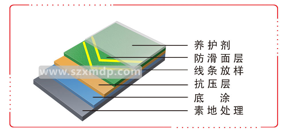 ![]() ◎ 車輛行駛時無明顯震動; ◎ 表面粗糙度均勻,起伏小,阻尼大; ◎ 即使有水或結冰,車輛行駛也很安全; ◎ 抗壓性好,表面硬度高,耐磨; ◎ 施工周期短,色彩美觀; ◎ 使用壽命長達10年以上。 | ![]() 素地處理:為增強地坪附著力,對基層進行打磨、除塵處理; 底 涂:涂刷1-2遍滲透性封閉底漆,增加附著力; 抗 壓 層:底涂干燥后整體批刮止滑抗壓中層材料; 找 平 層:再次打磨找平,進行吸塵處理; 線條放樣:待不粘腳后按設計劃線并粘貼美紋紙; 防滑面層:整體噴涂綠色或其他顏色防滑面層; 養 護 劑:防滑層干燥時滾涂或噴涂專用罩光劑養護車道。 |