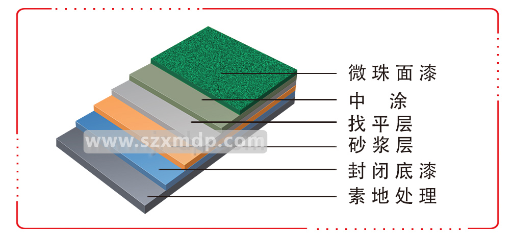![]() ◎ 選用無溶劑高級環(huán)氧樹脂加優(yōu)質(zhì)固化劑制成,無毒、無污染; ◎ 化學性能優(yōu)良,耐酸、堿、鹽、油類介質(zhì)腐蝕,特別耐強堿性能優(yōu); ◎ 平整光亮,整體無縫; ◎ 機械性能優(yōu)良,耐磨、耐壓、耐沖擊,有一定彈性; ◎ 施工快捷方便; ◎ 使用年限:1mm/6年,2mm/8年,4mm/10年。 | ![]() 素地處理:打磨、吸塵處理; 底 涂:涂刷1-2遍環(huán)氧樹脂強滲透封閉底漆; 砂 漿 層:環(huán)氧樹脂中涂料調(diào)石英砂,用鏝刀或平刀抹刮; 找 平 層:再次打磨找平,進行吸塵處理; 中 涂:批刮環(huán)氧樹脂中涂膩子層材料; 面 涂:用滾筒將環(huán)氧樹脂滾涂面漆滾涂于中涂涂層上; 防 滑 面:滾涂環(huán)氧樹脂面材料,并均勻拋灑石英砂,固化后掃掉浮砂,再罩上面漆; |