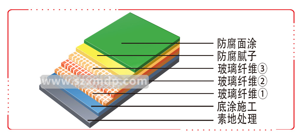 玻璃鋼三布五涂防腐地坪廣泛應用于嚴重腐蝕的環保電鍍、五金機械、電子化工企業車間、化學品儲存等區域的地面防腐、墻面防腐及設備基礎表面防腐。