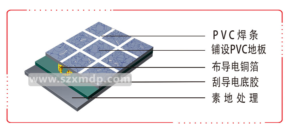![]() ![]() | ![]() 1、素地處理; 2、畫線:尋找中心線; 3、布導(dǎo)電銅箔; 4、鋪PVC靜電地板; 5、焊接:可根據(jù)要求焊接成整體無(wú)縫。 |